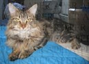 Shu ha il pelo lungo, manto tigrato. Segni ident.: pancia rasata.
