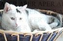 Micio e' di taglia media (5 kg), pelo medio, manto bianco pezzato grigio sul dorso e la coda, occhi giallo-verdi.