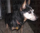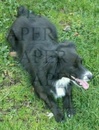 Spank e' di taglia piccola, a pelo medio-lingo, manto nero con macchia sul petto bianca. Porta un collare con medaglietta incisa.