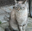 Mou, tgl. media, robusta, pelo corto, manto su base bianco crema con tigrature beige e marroni specie su muso, coda e zampe, occhi azzurri. Senza collare. Uscita e non tornata.