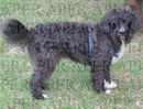 Andrea e' di taglia medio-piccola, a pelo medio-lungo e mosso, manto nero, petto e zampe in punta bianchi. Porta una pettorina turchese.