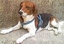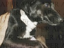 Clark e' di taglia piccola, muscoloso, pelo corto, manto bianco pezzato nero. Segni ident: pezzato nero su occhio dx. Porta una pettorina di pelle.