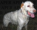 Zed e' di taglia media, pelo semi-lungo, manto bianco pezzato e maculato fulvo. Porta un collare rosso con medaglietta.