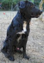 Giulia e' di taglia piccola, pelo riccio, manto nero con mento chiaro e macchia bianca sul petto. Senza collare. Scappata perche' spaventata dal temporale.
