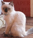 Il nostro gattino e' un cucciolo a pelo medio, manto color crema pezzato marrone su muso, zampe e coda, occhi azzurri. Porta un collarino azzurro.