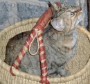 Fufi ha il manto tigrato grigio e nero. Porta un collarino rosso con campanellino.
