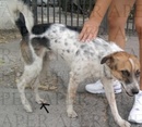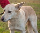 Lilly, tgl. media, pelo corto, manto bianco-beige, collare con medaglietta incisa. Segni ident.: orecchie a punta. Ha paura di cani e umani; scappata perche' si e' rotto il moschettone del guinzaglio quando ha strattonato per paura di un altro cane.