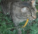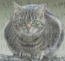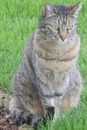 Virgola (anche detta Micia) e' di taglia medio-piccola, pelo corto, manto grigio beige tigrato, pezzato beige con sfumature fulve sul ventre e le zampe.
