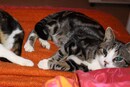 Coccoi e' di taglia media, pelo corto, manto grigio beige tigrato con sfumature fulve sul ventre e pezzato bianco sul muso. Senza collare.