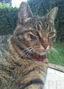 Toffee e' di taglia media, a pelo corto, manto pezzato: tigrato grigio e bianco. Porta un collarino rosa.Uscita dal giardino e non tornata.