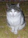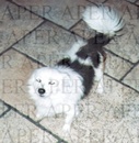 Trudy e' di taglia minuta, a pelo corto, manto pezzato bianco su petto, muso e ventre, grigio tigrato di nero su mascherina dorso e coda. Senza collare.